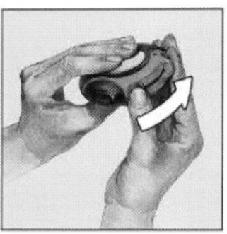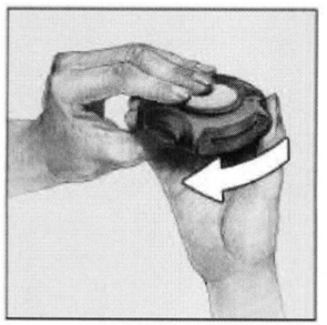 Держите корпус одной рукой, поместив большой палец другой руки в специальное углубление. Чтобы открыть ингалятор, нажимайте большим пальцем от себя до упора, пока не услышите щелчок.