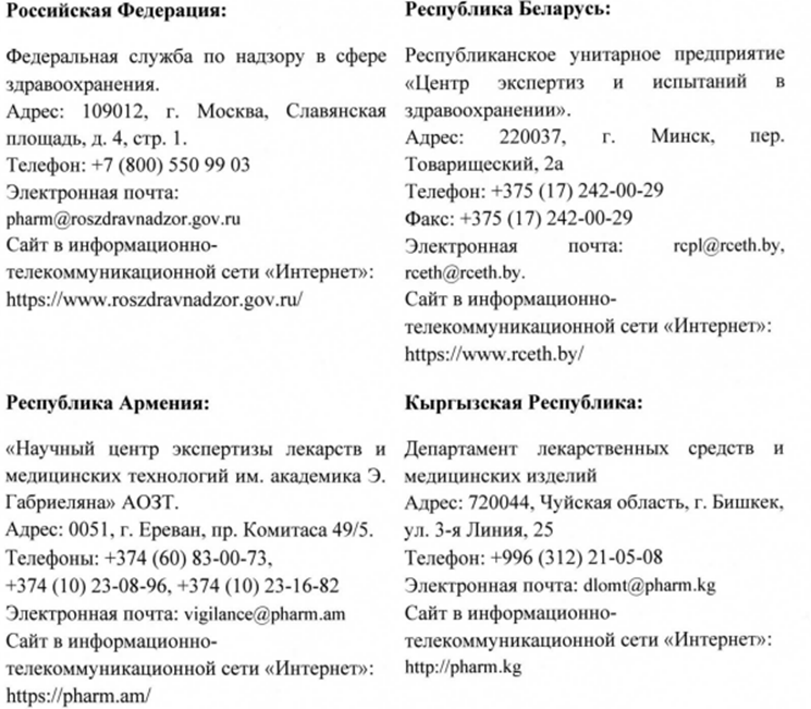 Если у Вас возникают какие-либо нежелательные реакции, проконсультируйтесь с врачом. Данная рекомендация распространяется на любые возможные нежелательные реакции, в том числе на не перечисленные в листке-вкладыше. Вы также можете сообщить о нежелательных реакциях напрямую (см. ниже) через систему сообщений государств-членов Евразийского экономического союза. Сообщая о нежелательных реакциях, Вы помогаете получить больше сведений о безопасности препарата.