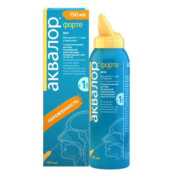 Средство для орошения и промывания полости носа для детей и взрослых «Аквалор® форте мини» 50 мл, «Аквалор® форте» 150 мл (далее по тексту средство) представляет собой аэрозоль в алюминиевом баллоне под давлением с полиэтиленовой анатомической насадкой для носа, создающей распыление «душ», с ограничительным кольцом и с полипропиленовым колпачком. Внутрь баллона помещен четырехслойный пакет с содержимым, снабженный специальным односторонним клапаном. Насадка имеет перемычку для контроля нажатия на аэрозольный клапан. Не является лекарственным средством.