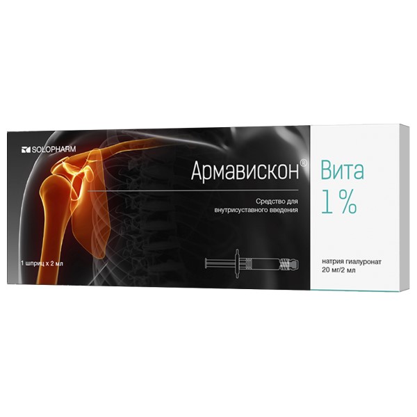 Армавискон® Вита представляет собой стерильный вязкий раствор натриевой соли гиалуроновой кислоты (натрия гиалуроната) высокой степени очистки, высокомолекулярный (молекулярная масса составляет не менее 3 МДа). Гиалуроновая кислота - необходимый компонент экстрацеллюлярного матрикса, присутствует в высоких концентрациях в составе хряща и синовиальной жидкости. Гиалуроновая кислота обеспечивает вязкость и эластичность синовиальной жидкости, а также она необходима для формирования хряща. При остеоартрозе отмечаются дефицит и качественные изменения гиалуроновой кислоты в составе синовиальной жидкости и хряща. Внутрисуставное введение гиалуроновой кислоты приводит к улучшению функционального состояния сустава. При использовании средства Армавискон® Вита при остеоартрозе коленного сустава отмечается улучшение клинического течения остеоартроза до шести месяцев с момента применения, наблюдается противовоспалительный и анальгетический эффект за счет восполнения объема и восстановления вязкости и эластичности синовиальной жидкости, которая заполняет полость сустава и выполняет роль внутрисуставной смазки. Она предотвращает трение суставных поверхностей, что позволяет устранить болевые ощущения и воспаление, а также защищает от преждевременного изнашивания и разрушения гиалинового хряща, обеспечивает подвижность, имеет амортизационные способности (гасит внешние удары, защищая компоненты сустава от повреждения).