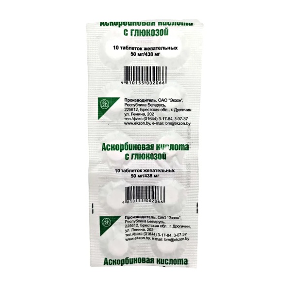 без рецепта жевательные, Экзон, Беларусь ИнструкцияАскорбиновая кислота с глюкозой, таблетки, 50 мг x10