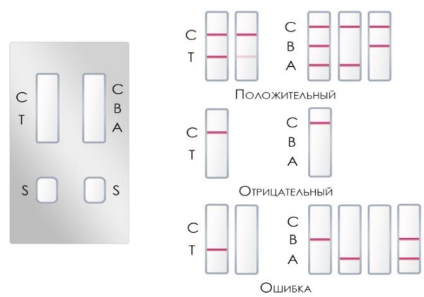 Положительный: Наличие двух или трех окрашенных линий (контрольная линия (C) и одна или две тестовые линии (T)) в зоне считывания результатов указывает на положительный результат.