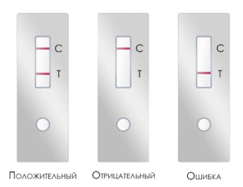 Положительный: наличие двух окрашенных линий (контрольная линия (C) и одна тестовая линия (T)) в зоне считывания результатов указывает на положительный результат.