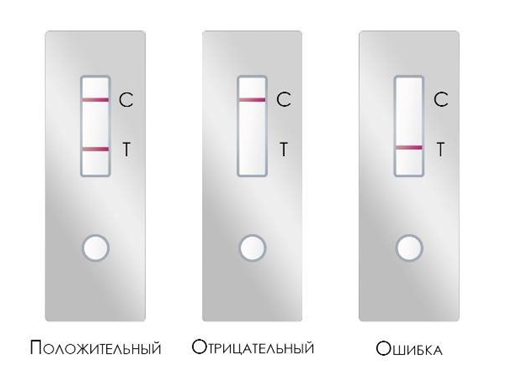 (контрольная линия (C) и одна тестовая линия (T)) в зоне считывания результатов указывает на положительный результат.