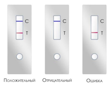 Отрицательный: Наличие только синей контрольной линии (C) в зоне считывания результатов указывает на отрицательный результат.