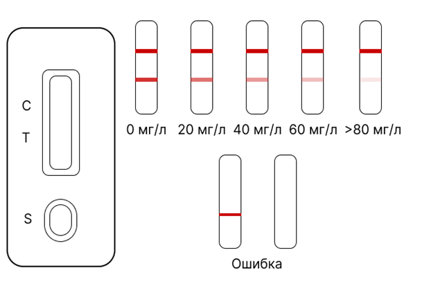 Положительный: наличие одной окрашенной линии (контрольная линия (C) в зоне считывания результатов, Отсутствие тестовой линии (Т) указывает на положительный результат, что означает повышенную концентрацию микроальбумина в образце (≥20 мкг/мл).