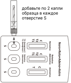 3. Открутите колпачок с устройства для забора кала и добавьте по 2 капли (~80мкл) полученного раствора в КАЖДОЕ НИЖНЕЕ отверстие для нанесения образца (S).