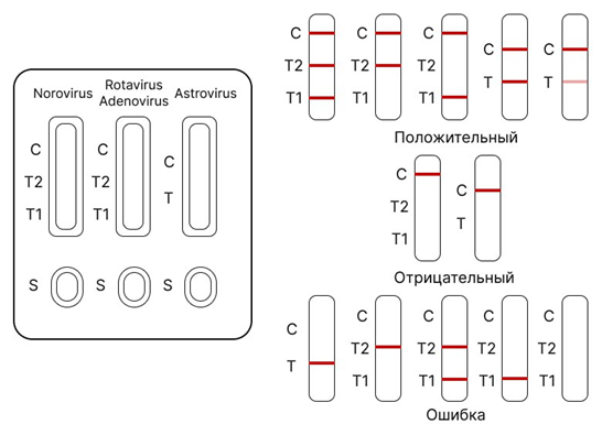 Примечание: в тест-полоске, определяющей ротавирус и аденовирус, линия Т1 означает наличие аденовируса, а линия Т2 – ротавируса. В тест-полоске, определяющей норовирус, линия Т1 означает наличие генотипа 1, а линия Т2 – генотипа 2 норовируса.