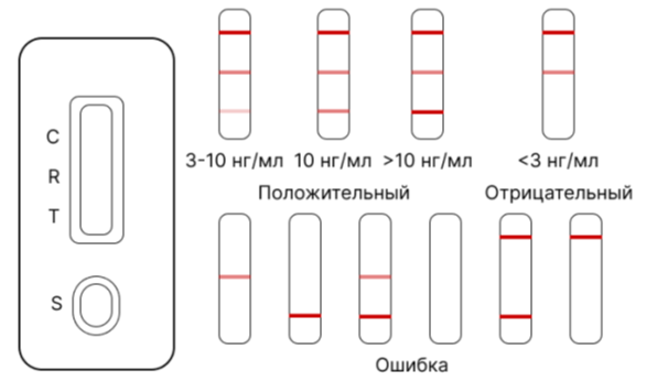 - если интенсивность окраски тестовой линии (Т) примерно равна интенсивности окраски референсной линии (R), то концентрация ПСА в образце равна ~10 нг/мл.