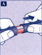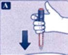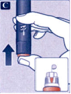 • Держа шприц-ручку иглой вверх, несколько раз слегка постучите по верхней части шприц-ручки кончиком пальца, чтобы пузырьки воздуха переместились вверх (рис. В).