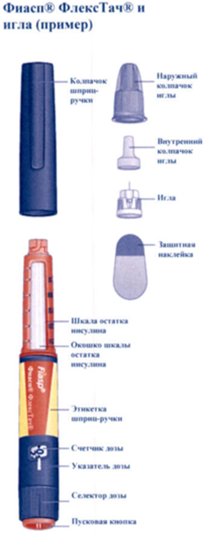 Сначала проверьте маркировку на этикетке шприц-ручки. чтобы убедиться, что она содержит препарат Фиасп 100 ЕД/мл, а затем изучите представленные ниже иллюстрации, на которых показаны детали шприц-ручки и иглы.