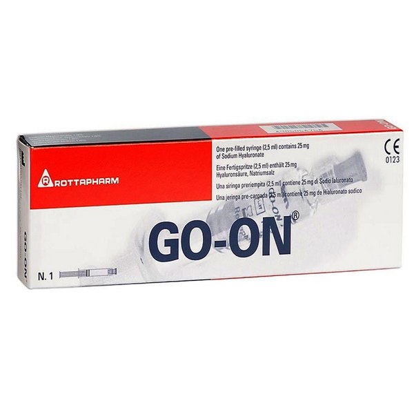 Шприц GO-ON® содержит 2,5 мл 1 % раствора гиалуроната натрия, а также хлорид натрия, моногидрофосфат натрия, дигидрофосфат натрия и воду для инъекций.