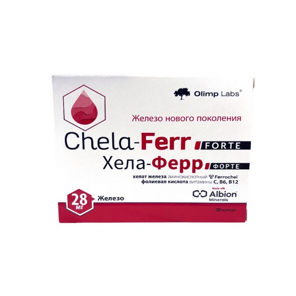 Биологически активная добавка к пище, рекомендованная в качестве дополнительного источника железа, фолиевой кислоты, витаминов С, В6 и В12. Хела-ФЕРР Форте содержит единственный в мире запатентованный хелат железа (Ferrochel). Состав дополнен витаминами С, В6, В12 и фолиевой кислотой, необходимыми для кроветворения.