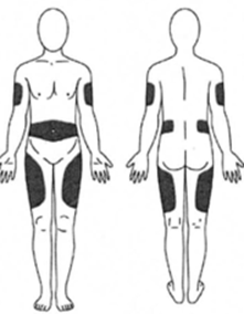 1. Выберите место инъекции (передняя брюшная стенка (отступая не менее 5 см от пупка), передняя и боковая поверхность бедра или средняя треть наружной части плеча (возможные места для инъекций закрашены на рисунке ниже)).