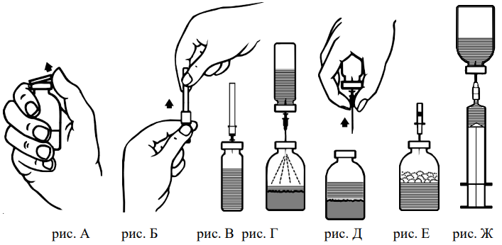 1. Снимите защитный колпачок с прилагаемой иглы-фильтра, поворачивая и потягивая его, и насадите иглу на стерильный одноразовый шприц. Наберите раствор в шприц (рис. Ж).