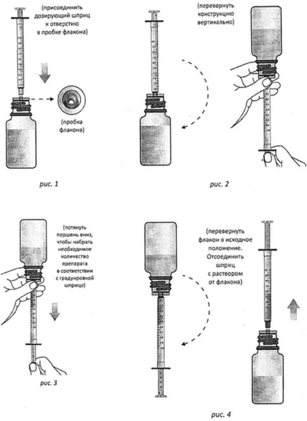 Перед началом использования препарата следует проверить целостность кольца первого вскрытия. Если она нарушена, флакон нельзя использовать — его следует вернуть в аптеку. Для того, чтобы точно отмерить необходимое количество раствора и, соответственно, дозу лекарственного препарата, необходимо присоединить дозирующий шприц к отверстию в пробке флакона и перевернуть конструкцию вертикально (см. рисунки). Потянуть поршень вниз, чтобы набрать необходимое количество препарата в соответствии с градуировкой шприца. Перевернув флакон в исходное положение, отсоединить шприц с раствором от флакона.