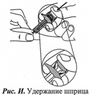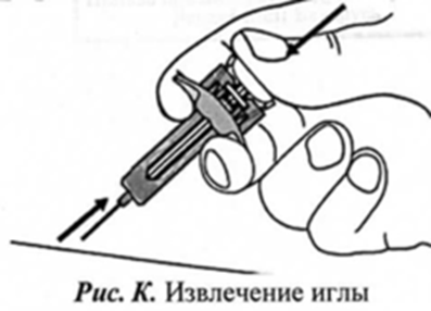 | • Держите поршень целиком вжатым, осторожно вытягивая иглу из места инъекции, пока она не выйдет из кожи (см. рис. К) |