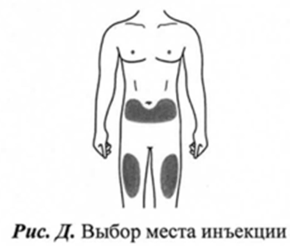 • Рекомендуемое место инъекции — передняя поверхность бедра. Также можно использовать нижнюю часть живота, но не ближе 5 см от пупка (см. рис. Д). • Каждый раз выбирайте для инъекции новое место. • Не выполняйте инъекцию на участке с чувствительной, покрасневшей, шелушащейся или загрубевшей кожей, а также в место гематомы. Избегайте областей со шрамами или растяжками. Если у вас псориаз, ЗАПРЕЩАЕТСЯ вводить препарат в участки кожи с псориатическими бляшками. |