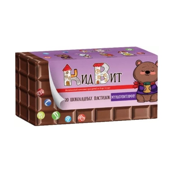 КидВит - это единственный в России бренд витаминов на основе натурального молочного шоколада. В составе - только натуральные ингредиенты. Не содержит ГМО, консервантов, пальмового масла и E-добавок.