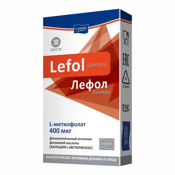ЛЕФОЛ ЛАМИРА – биологически активная форма фолиевой кислоты, в 1 таблетке содержится 400 мкг метилфолата.