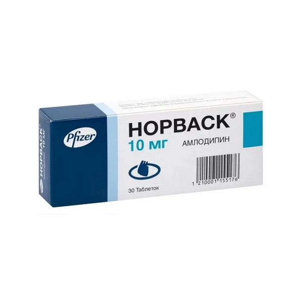 1 таблетка Норваск по 10 мг содержит 13,899 мг амлодипина бесилата, эквивалентного 10 мг амлодипина.