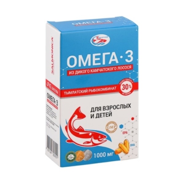 «Омега-3 из дикого камчатского лосося для взрослых и детей», (капсулы по 600 мг, 1000 мг) содержит полиненасыщенные жирные кислоты (ПНЖК). ПНЖК Омега-3 относятся к незаменимым жирным кислотам, так как не синтезируются в организме человека и должны поступать в достаточном количестве извне. Полиненасыщенные жирные кислоты Омега-3 необходимы для нормального функционирования органов и систем, поддержания красоты и здоровья кожи, волос и ногтей, оказывают выраженное положительное влияние на здоровье человека. ПНЖК Омега-3 способствуют снижению риска сердечно-сосудистых заболеваний, поддержанию баланса между уровнем холестерина и триглицеридов в крови, нормализуют обменные процессы в организме, снижают активность воспалительных процессов, способствуют укреплению и поддержанию иммунитета, нормальной функции костей и мышц, активности работы мозга. ПНЖК Омега- 3 являются важной составной частью биологических мембран, способствуют нормальному функционированию стенок сосудов, нервных клеток. Ежедневный прием Омега-3 способствует поддержанию эластичности и упругости кожи, уменьшению воспалительных процессов, и как следствие общее оздоровление кожи, ногтей и волос. ПНЖК Омега-3 тормозят процессы тромбообразования, нормализуют мозговое кровообращение, повышают устойчивость сосудов головного мозга при гипоксии и падении артериального давления, обладают противовоспалительным действием. Прием Омега-3 способствует снижению выраженных симптомов повышенной тревожности.