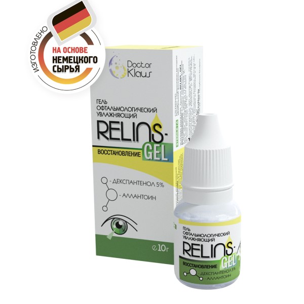 RELINS-GEL восстановление представляет собой стерильный прозрачный с возможной опалесценцией легкотекучий гель без посторонних включений, применяемый в виде глазного геля для закладывания в конъюнктивальный мешок.
