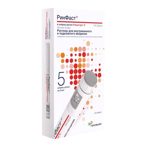 Снижение уровня сахара в крови начинается через 10-20 минут после инъекции препарата РинФаст®, максимальный эффект препарата наступает через 1-3 часа после инъекции. Действие препарата продлится 3-5 часов. В связи с коротким действием препарата РинФаст®, его следует использовать в комбинации с инсулином длительного или средней продолжительности действия.