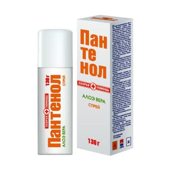 Спрей косметический для лица и тела Пантенол товарного знака Скорая помощь средство для устранения симптомов солнечных и термических ожогов. Действие и эффективность спрея Пантенол с Алоэ Вера обусловлены сочетанием натуральных активных компонентов.