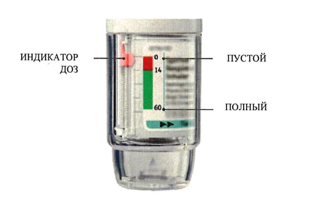 • Когда индикатор доз покажет на красную область шкалы, это означает, что лекарства осталось примерно на 7 дней (14 ингаляционных доз).
