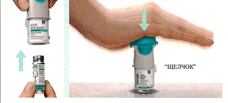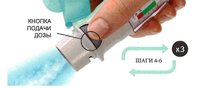 • Делая медленный, глубокий вдох через рот, нажмите кнопку подачи дозы и продолжайте делать вдох.