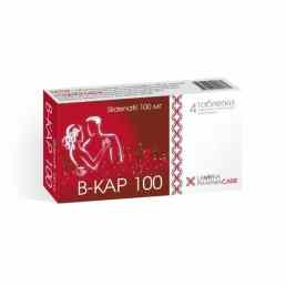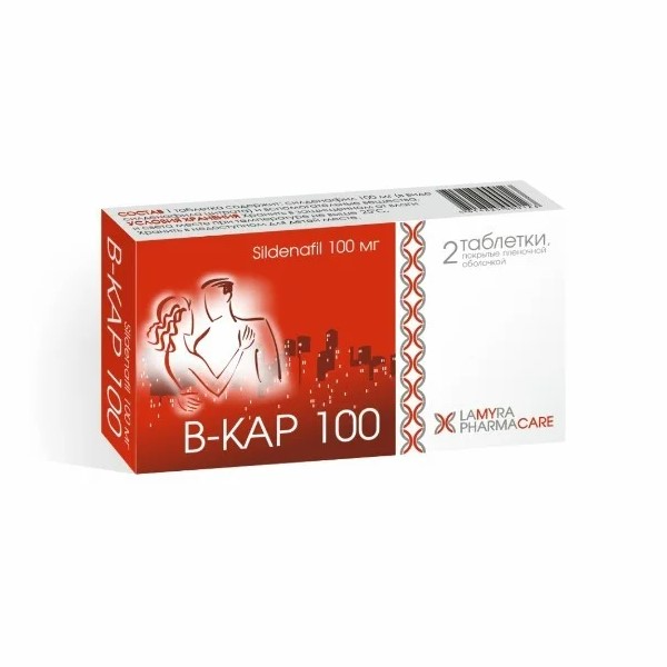 В-кар быстро всасывается при пероральном приеме, абсолютная биодоступность составляет 40%. Его фармакокинетика дозозависима в интервале рекомендуемых доз. Он элиминируется преимущественно печеночным метаболизмом (системой цитохрома Р4503А4), превращаясь в активный метаболит; активное вещество и метаболит имеют одинаковый период полувыведения (Т1/2) 4 часа. Пик концентрации в плазме достигается через 30-120 минут при пероральном приеме натощак. Средний объем распределения при равновесном состоянии (Vd) составляет 105 л, что свидетельствует о распределении по всем тканям организма. Силденафил и его активный N-дисметилметаболит связываются с белками плазмы на 96% независимо от принятой пероральной дозы.