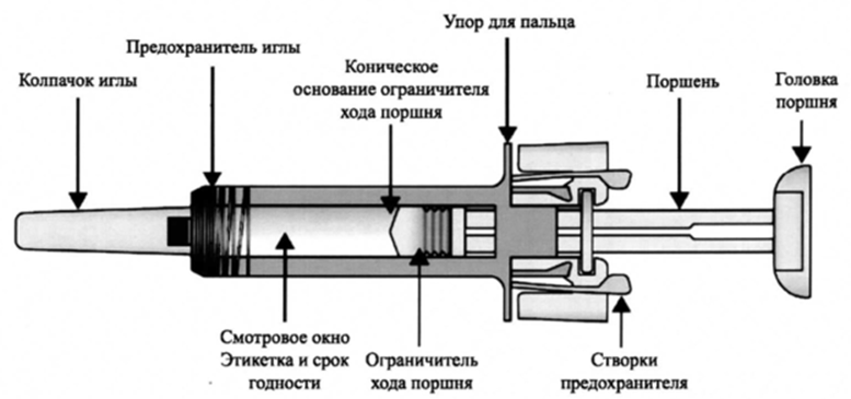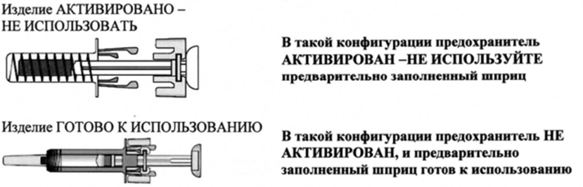 После введения лекарственного препарата, чтобы закрыть иглу, будет активирован предохранитель. Предохранитель иглы предназначен для защиты медицинских работников, лиц, осуществляющих уход, и пациентов от случайного укола иглой после инъекции.